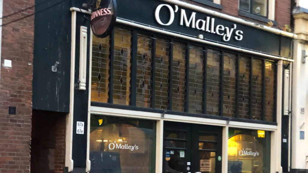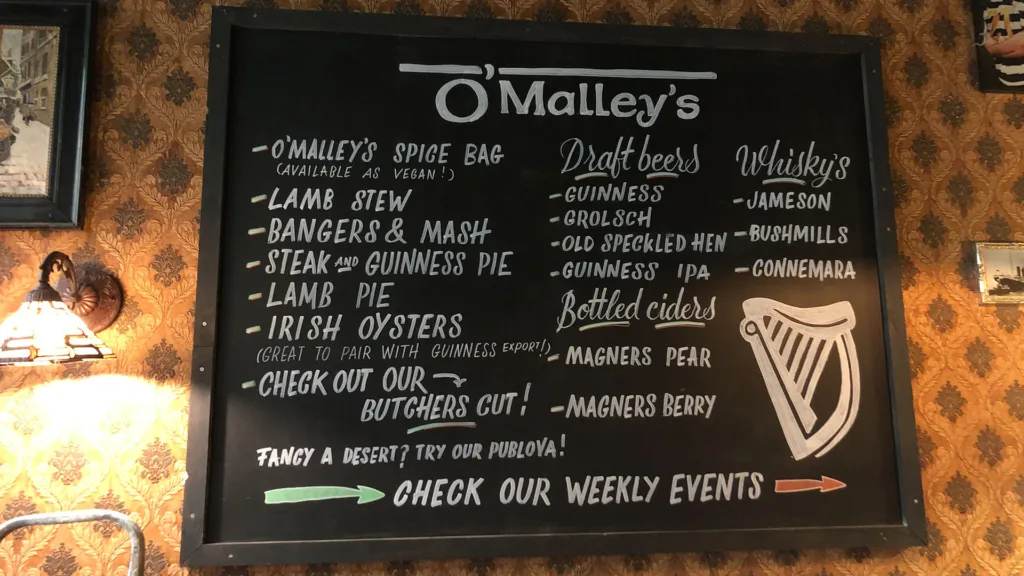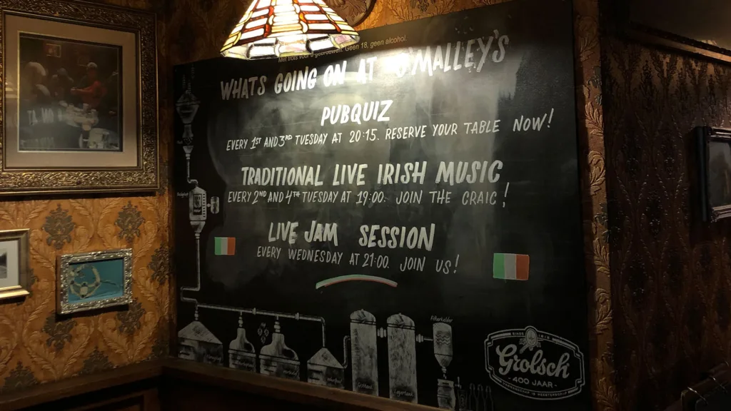 O’Malley’s ademt karakter. Donker hout, warme verlichting, muziek op de achtergrond, een echte pub. Dat vroeg om lettering die daarbij past: helder, leesbaar, maar met genoeg karakter om onderdeel te worden van het interieur in plaats van iets dat er los bovenop ligt.